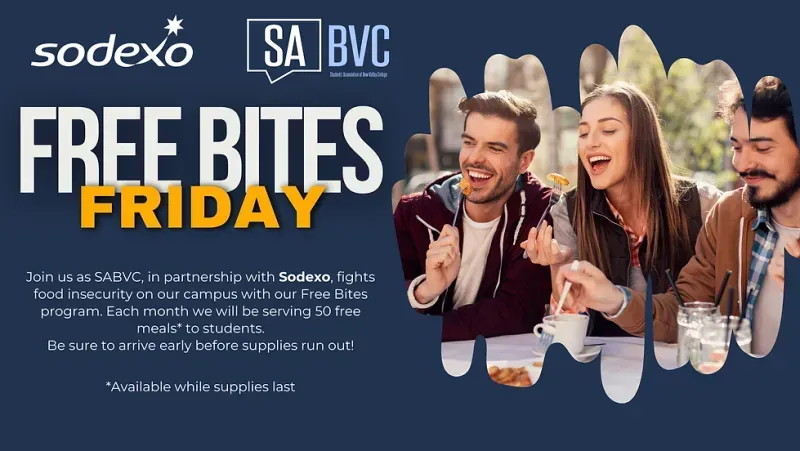 Join us as SABVC, in partnership with Sodexo, fights food insecurity on our campus with our Free Bites program. Each month we will be serving 50 free meals* to students. Be sure to arrive early before supplies run out!