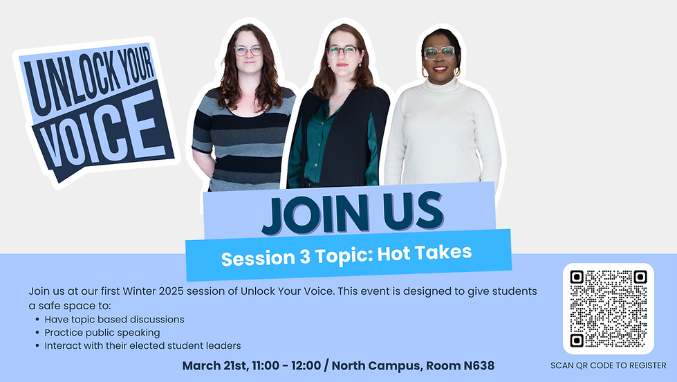 SABVC wants to invite you to join us at our final Winter 2025 session of Unlock Your Voice. This event is designed to give students a safe space to have topic based discussions, practice public speaking, interact with their elected student leaders, and more! Session 3 topic will be all about "Hot Takes". Pre registration is encouraged but not mandatory. Students can pre register by visitng https://www.sabvc.ca/event-details-registration/unlock-your-voice-session-3-topic-hot-takes